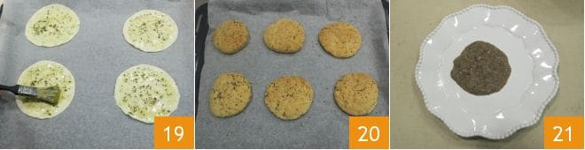 usa la emulsión obtenida para pincelar la superficie de los círculos de masa 19. Hornea las hojas de masa en horno estático a 180° durante unos 10-15 minutos o hasta que la superficie esté ligeramente dorada 20. Ahora puedes montar las milhojas: toma un plato para servir la porción individual, unta una capa de crema de lentejas 21,