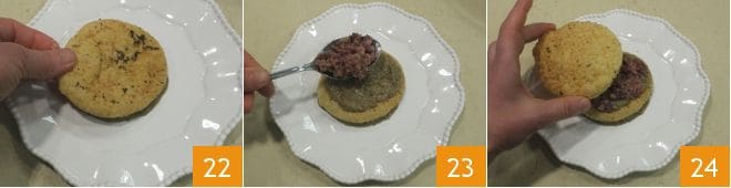 coloca un disco de masa 22, luego cubre con una capa de crema y una de cotechino desmenuzado 23, superpone un segundo círculo de masa 24