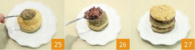 y de nuevo una capa de crema de lentejas 25 y una de cotechino 26, finalmente cierra con un tercer disco. Las milhojas de cotechino y lentejas están listas 27 para ser llevadas a la mesa.