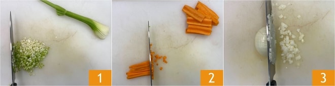 Para realizar el minestrone a la genovesa, primero preparad el Caldo de verduras, luego dedicad tiempo a limpiar las verduras: limpiad y cortad en brunoise el apio 1, la zanahoria 2 y la cebolla 3.