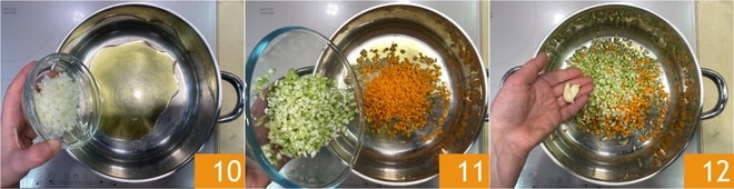 Calentad un hilo de aceite en una cacerola, luego verted el picado de cebolla 10, zanahoria y apio 11. Agregad el diente de ajo machacado 12 y dejad sofreír durante unos minutos.