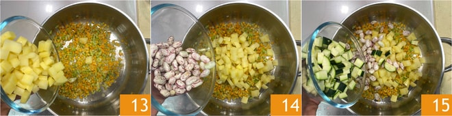 Unid la patata 13, los frijoles 14 y el calabacín 15.