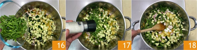 Agregad también las judías verdes 16, luego salpimentad 17. Mezclad 18 y dejad sofreír durante un par de minutos más.