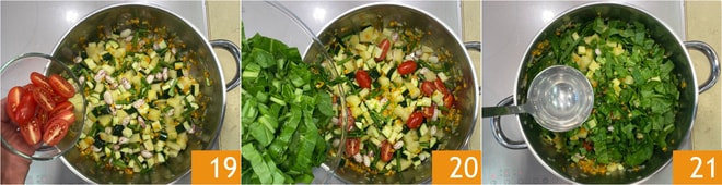 En este punto, añadid los tomates cherry 19 y las acelgas 20, luego cubrid con el caldo vegetal 21.