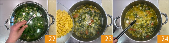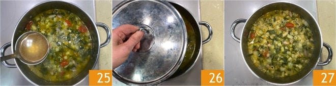 Mezclad y añadid más caldo, si es necesario 25, luego cubrid nuevamente 26 hasta que la pasta esté cocida 27. Ajustad de sal y pimienta, si es necesario.