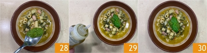 Completad los platos con una cucharada generosa de pesto 28, adornad con algunas hojas de albahaca y condimentad con un hilo de aceite crudo 29. ¡Tu minestrone a la genovesa está listo para ser servido 30!