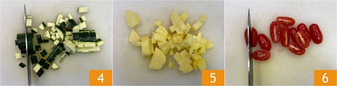 Reducid el calabacín 4 y la patata a cubos de 1 cm 5, luego dividid los tomates cherry a la mitad 6.