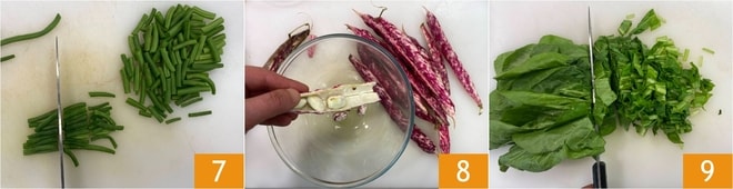 Recortad y cortad las judías verdes en rombos 7, luego desgranad los frijoles frescos y recogedlos en un bol 8. Finalmente, cortad en tiras gruesas las acelgas 9.