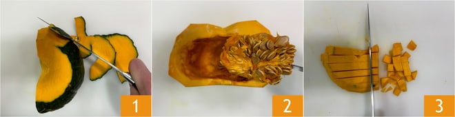 Para preparar el minestrone de verduras al microondas, como primera cosa lavad y secad las verduras. Eliminad la piel de la calabaza 1. Con una cuchara retirad las semillas y los filamentos internos 2. Luego cortad primero en rebanadas de igual grosor y luego en cubos de aproximadamente 1 cm de lado 3.