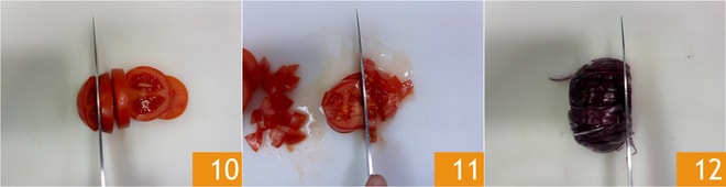 Cortad también los tomates primero en rebanadas 10 y luego en cubos 11. Picad finamente la cebolla 12.