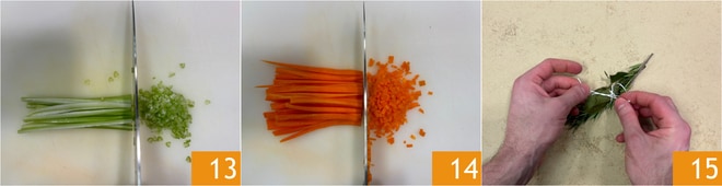 Reducid a cubos el apio 13, pelad las zanahorias y cortadlas primero en tiras y luego en cubos 14. Atad con un hilo de cocina la ramita de romero y las hojas de laurel para formar un ramo aromático 15.