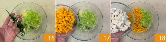 En un bol grande, de pyrex, poned las cebollas, las zanahorias y el apio, añadid los puerros y el ramo aromático 16. Agregad la calabaza 17 y la coliflor 18.
