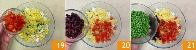 Añadid los calabacines, las patatas, los tomates 19, los frijoles borlotti 20 y los guisantes 21.