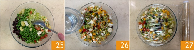Mezclad bien todo 25, luego verted el agua 26. Cubrid el bol con film 27 y cocinad en el microondas a 800 W durante 12 minutos.