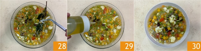 Eliminad el ramo aromático 28 y aderezad con un chorrito de aceite 29. El minestrone de verduras al microondas está listo para ser servido 30.