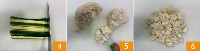 Quitad los extremos de los calabacines, cortadlos primero en rebanadas y luego en cubos del mismo tamaño que la calabaza 4. Cortad a la mitad la coliflor 5, eliminad el tronco central y separad las florecillas 6.
