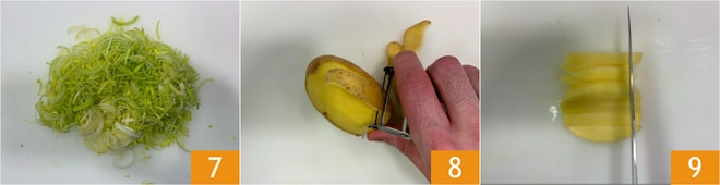Retirad la parte externa del puerro y cortadlo en rodajas finas 7. Pelad las patatas 8, cortadlas en rodajas gruesas y luego en cubos 9.