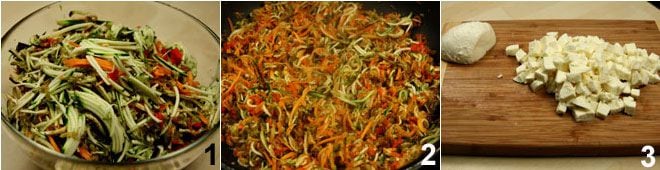 Primero prepara la masa para la pizza con las dosis indicadas arriba y siguiendo el procedimiento que encuentras Masa para pizza Déjala fermentar en un lugar tibio y seco durante aproximadamente 2 horas, hasta que la masa haya duplicado su volumen. Cuando la masa haya fermentado, comienza a preparar el relleno de verduras lavando y cortando finamente (en juliana) diversas variedades de verduras, nosotros hemos usado calabacines, berenjenas, zanahorias y pimiento 1. Ponlas en una sartén con una cuchara de aceite y saltéalas durante unos minutos a fuego vivo, añade sal y pimienta 2. Corta la mozzarella en cubos 3 y ponla en un colador para que pierda el exceso de agua.