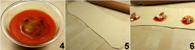 Para el relleno clásico, condimenta 100 ml de salsa de tomate con un poco de aceite y sal 4, corta la mozzarella en cubos, escúrrela bien y el jamón cocido en trocitos. Extiende la masa sobre una superficie en rectángulos de aproximadamente 18 cm de ancho y 2 mm de grosor 5, coloca el relleno en pequeños montoncitos 6 dispuestos en el centro del rectángulo (con las dosis de la receta saldrán 10 mini calzones de tomate, mozzarella y jamón y 10 de verduras y mozzarella),