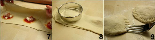 levanta la masa de un lado y cubre el relleno superponiéndola sobre el otro lado 7. Ayúdate con un cortapastas de 10 cm de diámetro o con un vaso para cortar los calzones en forma de media luna 8 y con los bordes de un tenedor presiona el lado para sellar 9. Unta ligeramente los mini calzones con aceite y hornéalos en horno ventilado a 230°C durante 10/15 minutos. Los mini calzones al horno se deben servir calientes, ¡pero cuidado de no quemarte con el relleno!