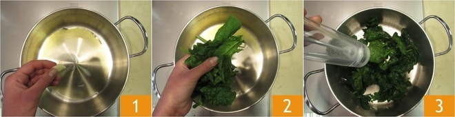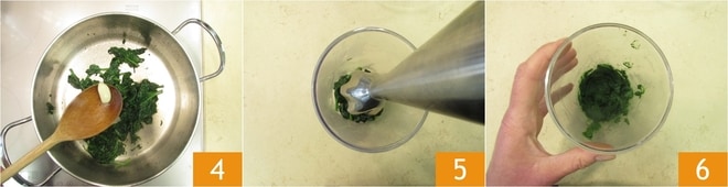 Cocina durante 5 minutos a fuego alto, mezclando hasta que se marchiten. Elimina el ajo 4, transfiere las espinacas cocidas a un vaso alto y tritúralas con una batidora de inmersión 5. Reserva la crema obtenida 6.