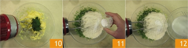 Vierte también las espinacas trituradas en el bol 10, trabaja rápidamente con las varillas y añade la harina, la levadura instantánea y la leche 12.