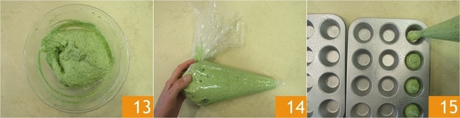Trabaja con las varillas hasta obtener una masa homogénea 13. Transfiere la masa a una manga pastelera sin boquilla 14 y llena un molde para 12 mini muffins 15; con estas cantidades obtendrás 36 muffins. Hornea en horno estático precalentado a 180° durante 20 minutos.