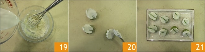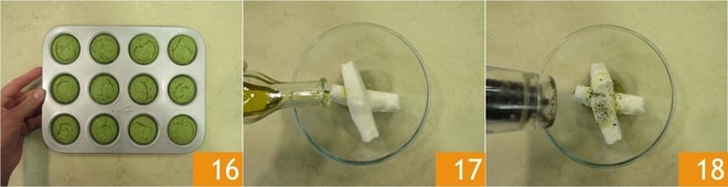 Una vez cocidos, saca los muffins del horno y déjalos enfriar 16. Mientras tanto, realiza la crema de queso de cabra vertiendo en un bol el queso, un poco de aceite 17, la sal y la pimienta 18.