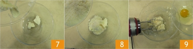 En un bol, vierte la mantequilla blanda 7 y el queso rallado 8. Trabaja los ingredientes con las varillas eléctricas durante unos 2 minutos. Añade al compuesto el huevo 9, trabaja hasta que se absorba completamente.