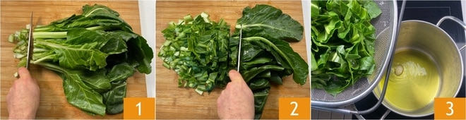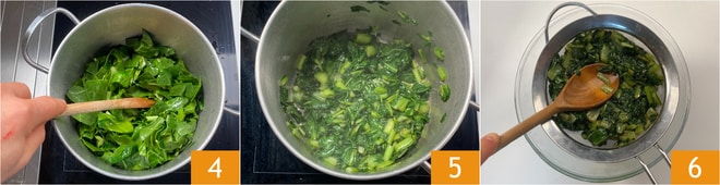 Sofríe a fuego alto durante unos minutos 4, luego baja ligeramente el fuego, cubre con la tapa y cocina durante unos 15 minutos. Al final de la cocción, el fondo debe estar casi seco 5, pero para mayor seguridad, transfiere las hierbas a un colador y presiónalas para eliminar el exceso de líquido 6. Deja que se templen.