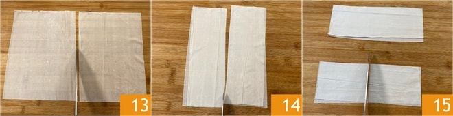 Ahora dedícate a las cestitas de masa filo: toma una hoja de masa filo y divídela por la mitad 13, luego superpón los rectángulos obtenidos y córtalos nuevamente por la mitad a lo largo 14. Divide las tiras nuevamente en dos para obtener 8 rectangulitos por cada hoja de masa filo. Continúa de esta forma con todas las demás hojas 15.