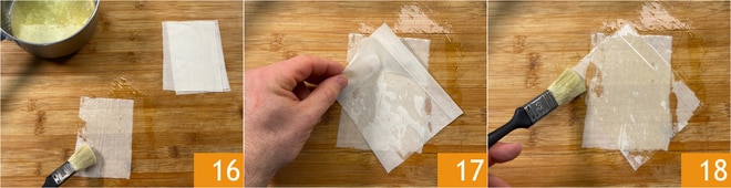 Coloca un rectangulito sobre la superficie de trabajo y úntalo ligeramente con la mantequilla derretida 16. Superpón un segundo rectangulito en diagonal 17 y úntalo también 18.