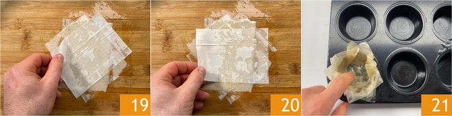 Coloca el tercer rectangulito siempre en diagonal pero en la dirección opuesta 19 y unta también este. Finalmente, coloca el cuarto rectangulito transversalmente respecto al primero 20 y úntalo de nuevo. Transfiere todo a un molde para muffins que hayas previamente engrasado y presiona para darle forma de cestita 21. Continúa así para realizar todas las cestitas, necesitarás 4 rectangulitos para cada una: recuerda untar siempre cada capa.