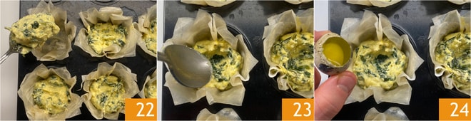 Cuando todas las cestitas estén listas, rellénalas con la mezcla de ricotta y hierbas 22. Con la ayuda de una cuchara, haz un hueco en la cima 23 y deja caer dentro un huevo de codorniz, que habrás cascado delicadamente 24.