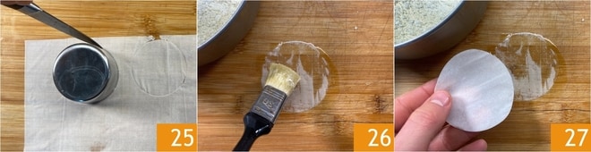 En este punto, crea las tapas para las cestitas: corta los rectangulitos restantes de masa filo con un cortador de galletas de un diámetro ligeramente inferior al del molde para muffins 25. Superpón 2 círculos de masa filo para cada cestita, untándolos siempre con un poco de mantequilla derretida 26 27.