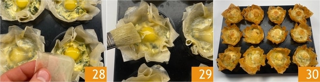 Coloca las tapas así perforadas sobre el relleno de cada cestita 28 y unta ligeramente la superficie 29. Cocina en horno estático precalentado a 200° durante unos 20 minutos, luego activa el grill a 220° y continúa la cocción durante 10 minutos hasta que estén doradas. Saca del horno y sirve tus mini pasqualinas de masa filo calientes o a temperatura ambiente 30!