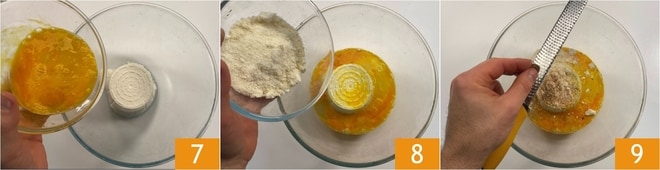 Mientras tanto, prepara el relleno: vierte los huevos batidos en un bol en el que hayas puesto la ricotta 7, luego añade el Parmigiano Reggiano DOP rallado 8 y la nuez moscada 9.