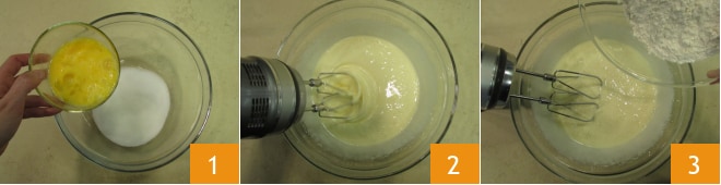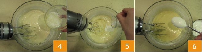 Posteriormente, añadid 30 g de mantequilla previamente derretida (en el microondas o en un cazo a fuego bajo) y continuad mezclando con las batidoras a velocidad baja 4. Cuando la mantequilla se haya absorbido, añadid la leche poco a poco, siempre mezclando con las batidoras 5 y finalmente incorporad el yogur una cucharada a la vez 6.