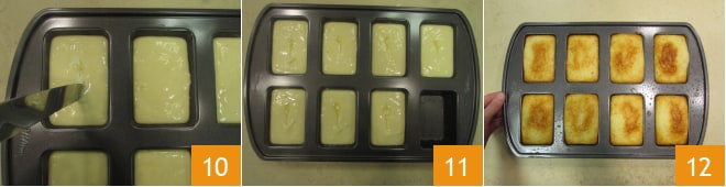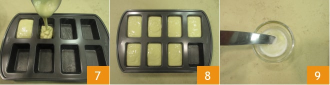 En este punto, engrasad el molde para mini plumcake (cada espacio mide 6x9 cm), verted la mezcla con la ayuda de un cucharón 7. Llenad los espacios 8 y derretid los 20 g de mantequilla restantes. Sumergid en la mantequilla derretida la punta de un cuchillo (usad uno de punta redondeada) 9.