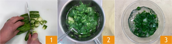 Para preparar los mini strudel con acelgas, ricotta y speck, lo primero que hay que hacer es ocuparse del relleno: lava las acelgas y córtalas en trozos 1. Hierve durante 5 minutos en agua con sal, luego escurre 2 y enfría en agua con hielo 3.