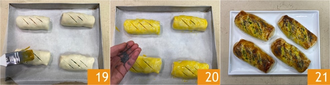 Coloca los mini strudel en una bandeja cubierta con papel de horno y pincela la superficie con la yema de huevo batida 19, luego espolvorea con semillas de amapola 20. Hornea en horno estático precalentado a 200° durante 20-25 minutos o hasta que el hojaldre esté crujiente y dorado. Retira del horno y deja templar los mini strudel con acelgas, ricotta y speck durante unos minutos antes de servirlos 21!