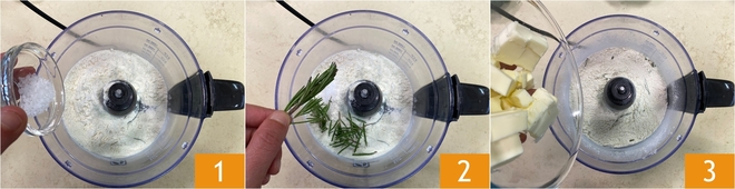 Para preparar las mini tartas con patatas, brócoli y anchoas, comienza con la base de masa quebrada salada: en el vaso de la batidora coloca la harina, la sal gruesa 1 y algunas agujas de romero fresco 2. Añade ahora la mantequilla fría en cubos, directamente del frigorífico 3.