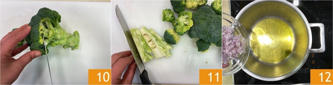 Ahora dedícate al brócoli: separa las flores 10 y, con un cuchillo afilado, divide el tallo por la mitad y luego córtalo en trozos más pequeños, eliminando las partes más duras 11. En una cacerola grande, calienta un chorrito de aceite de oliva virgen extra, luego añade la chalota picada 12 y déjala sofreír suavemente durante unos 7-8 minutos, removiendo de vez en cuando hasta que esté suave y transparente.
