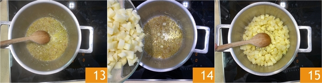 Cuando la chalota esté lista 13, añade las patatas 14, mezcla bien y deja que se sazone durante unos minutos a fuego medio 15.