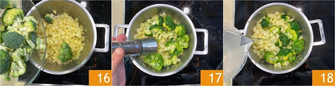 Añade ahora también el brócoli, tanto las flores como el tallo 16, sazona con sal y pimienta al gusto 17 y vierte agua caliente hasta cubrir las verduras 18. Cocina con la tapa durante unos 30 minutos, hasta que todos los ingredientes estén bien blandos.