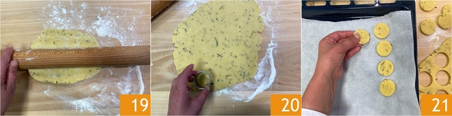 Mientras la crema se cuece, saca la masa quebrada salada del frigorífico. Espolvorea ligeramente la superficie con harina y, ayudándote con un rodillo, extiende la masa a un grosor uniforme de unos 3-4 mm 19. Con un cortapastas de 4 cm de diámetro, corta muchos discos regulares que serán la base crujiente de tus mini tartas 20. Colócalos en una bandeja forrada con papel de horno, separándolos ligeramente entre sí 21, luego hornéalos en horno estático precalentado a 180 °C durante unos 30 minutos, hasta que estén bien dorados.