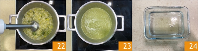 Cuando las verduras estén listas, tritúralo todo con una batidora de mano 22 hasta obtener una crema suave y aterciopelada, de color verde brillante 23. Pon a remojar la gelatina en láminas en agua fría durante unos minutos 24.