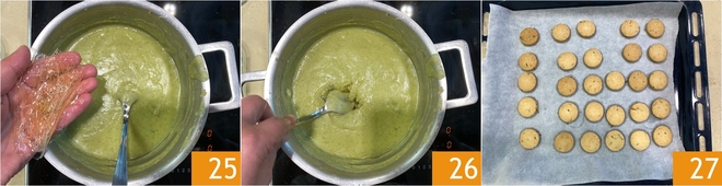 Luego estruja bien la gelatina 25 y añádela a la crema aún caliente, mezclando con cuidado para que se disuelva completamente 26. Mezcla hasta obtener una consistencia homogénea y brillante, luego deja que se temple y transfiere la crema al frigorífico para que se endurezca. Una vez cocidas, saca las bases del horno y déjalas enfriar completamente 27.