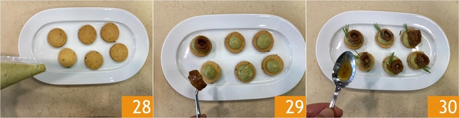 Transfiere la crema de brócoli a una manga pastelera y exprime una pequeña cantidad sobre cada base 28, formando un montículo redondo y compacto. Añade un filete de anchoa en salsa picante enrollado sobre la crema 29 y completa con un poco de salsa picante 30. Decora con una ramita de romero fresco y sirve tus mini tartas con patatas, brócoli y anchoas!