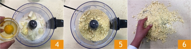 Incorpora un huevo entero 4, luego enciende la batidora en pulsos hasta obtener una mezcla de consistencia arenosa 5. Vierte todo sobre la mesa de trabajo 6 y comienza a compactarlo con las manos: debes trabajarlo solo el tiempo necesario para obtener un bloque homogéneo.